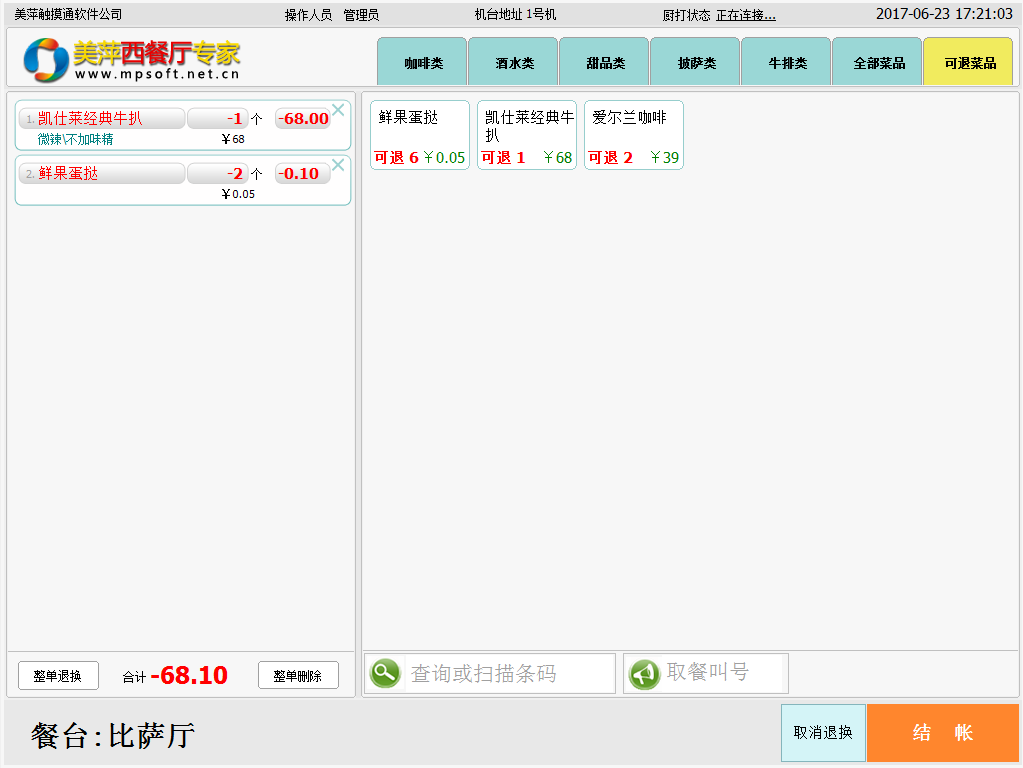 | 3.退换菜操作:只有堂吃和外卖收过款后才能在新近账单的单据中进行此操作。 |