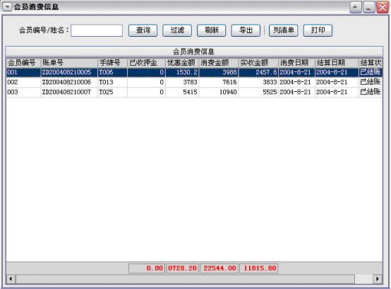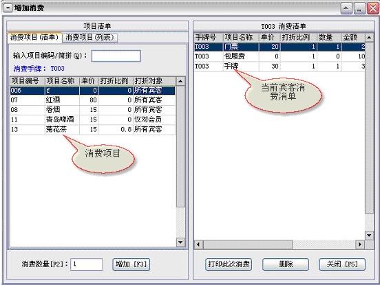 点单消费→增加消费:客人在消费过程中所消费的所有项目均要进行入帐处理,以便在客人离店时自动计算消费额。客人的消费明细便是在此入帐。