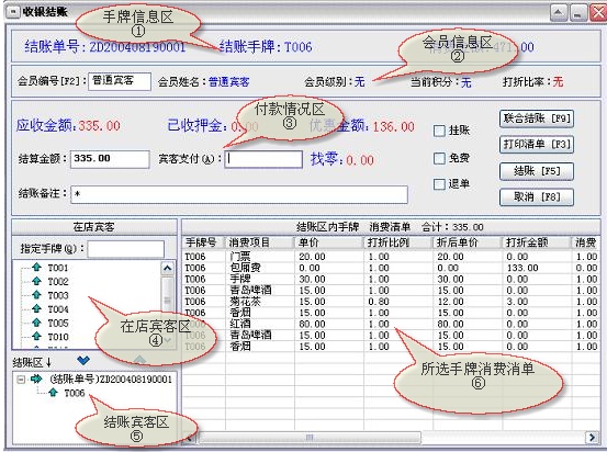 收银结账→宾客结帐:终结客户当前的消费活动,并进行收款及自动还原包厢项目(手牌)的占用状态为可供状态。 |