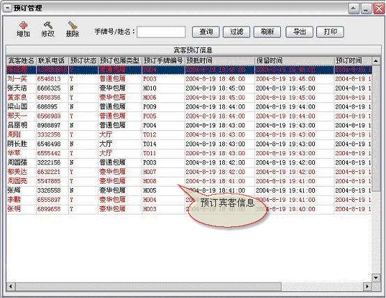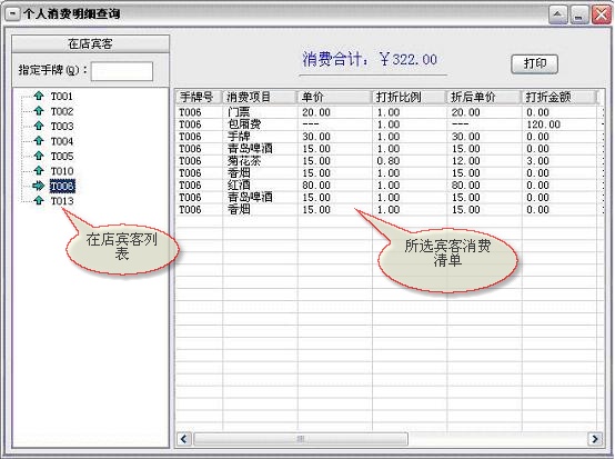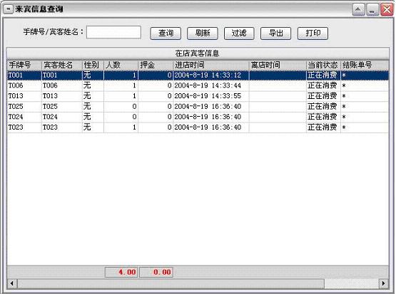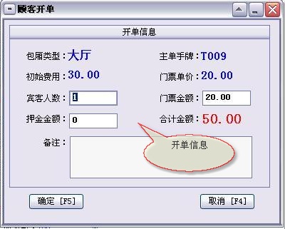 来宾登记→顾客开单:每个客户发生消费前必须进行登记(建立客户帐),给客户安排一个包厢(手牌)等包厢项目,包厢项目必须是在“系统设置”模块中的“包厢项目”中已经设置,系统只能对已设置的包厢项目(手牌)进行登记。