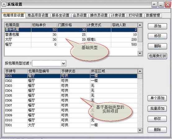 包厢项目:包厢项目也可以理解为包厢的种类(例如可分为豪华包厢、普通包厢等)。具体到某个包厢类型都有其相对应的手牌,而每个手牌就具体到某一来店登记的宾客,一般把手牌提供给一个客人后,在当前客人未退出占用状态前暂时无法提供给另一个客人消费。此项目在系统设置中设置,在宾客开单时使用。