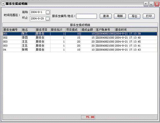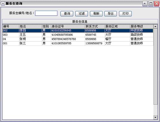 服务生设置:服务生是指能为宾客提供服务的本店员工,在此设置中可增加、修改、删除服务生信息,还可为每个服务生设置相应的服务生等级(例如:高级技师、中级技师、普通技师等)。有了服务生等级可在商品项目中为每种服务项目所对应的服务生等级设置相应的提成金额(如果有此需求),此项设置可为宾客提供服务的服务生自动计算提成金额。