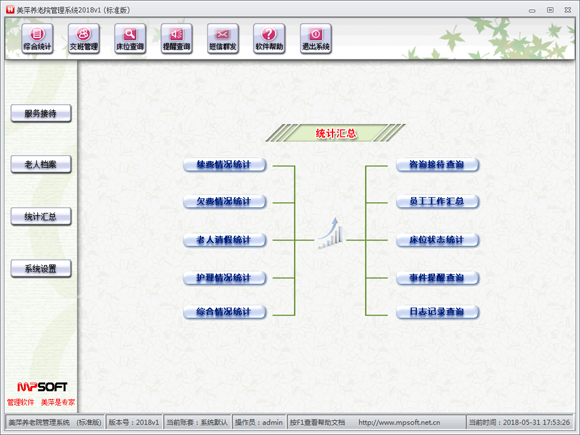 3.统计报表丰富,可对老人的续费、欠费、缴费、请假、护理情况,床位实时使用情况,咨询接待、员工工作情况进分析汇总。