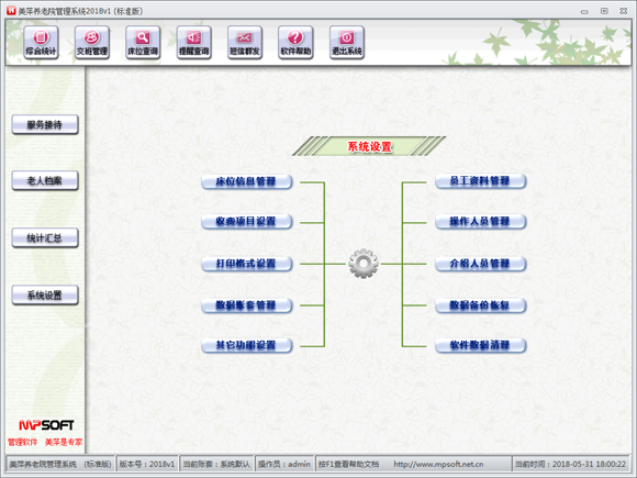 美萍养老院管理系统是一款根据养老机构业务特点设计的专用管理软件,界面设计简洁、美观、易用。软件涵盖咨询接待、档案管理、员工、房间床位、护理、外出登记、事件记录提醒、费用管理、护理管理、短信及微信消息提醒、统计汇总、系统设置等模块。涉及从咨询、接待、入住到退住的所有流程。系统设计以具体的业务对象为目标,以老人为中心,以业务为主线,充分重视客户的管理特色和风格。通过明确岗位职能,科学规范管理,有效提高人员工作效率,提升服务质量和竞争力。
