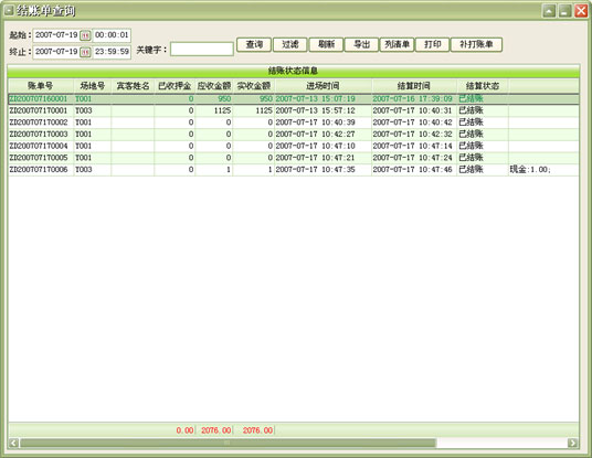 收银结账→宾客结帐:终结客户当前的消费活动,并进行收款及自动还原场地项目(场地)的占用状态为可供状态(或清理状态)。