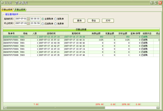第 七 步、查询模块: 查询来宾信息、收银明细、打印营业情况日、月报表、提成查询、统计分析营业收入及宾流量等。