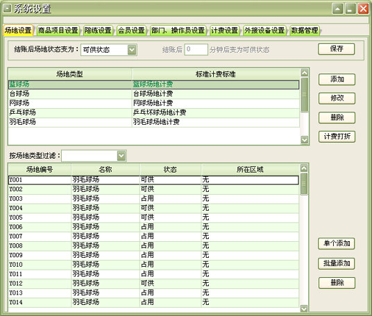 场地:场地可分为羽毛球场地、乒乓球场地和等其它场地(可任意添加多个场地),每个场地就具体到某一登记的宾客,一般把场地提供给一个客人后,在当前客人未退出占用状态前暂时无法提供给另一个客人消费。此项目在系统设置中设置,在场地开单时使用。