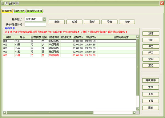 陪练设置:陪练是指能为宾客提供服务的本店员工,在此设置中可增加、修改、删除陪练信息,还可为每个陪练设置相应的陪练等级(例如:高级陪练、中级陪练、普通陪练等)。有了陪练等级可在商品项目中为每种服务项目所对应的陪练等级设置相应的提成金额(如果有此需求),此项设置可为宾客提供服务的陪练自动计算提成金额。