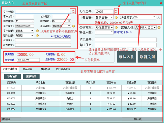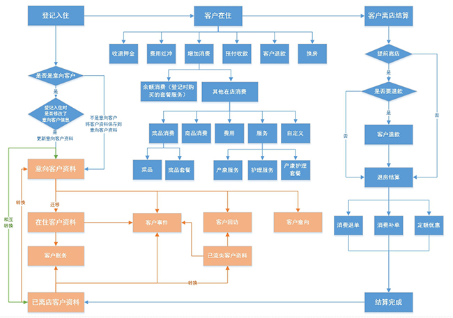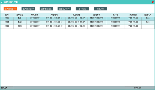 功能介绍:该模块集中显示在店入住过的客户资料,方便做售后回访发掘二次消费可能。