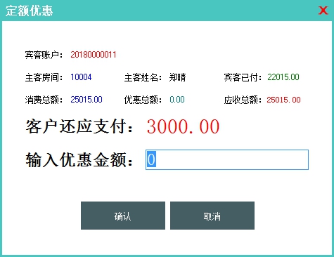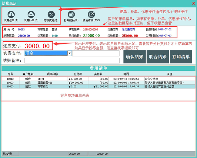 结算:对增加的消费信息即时计算,并将消费信息和支付信息计入到在住客房的费用清单中。