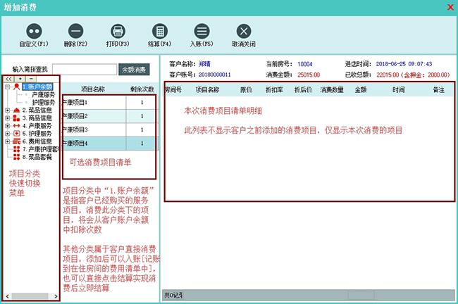 增加消费后需要点击“入账”确认消费,将消费项目信息记入到客户的费用清单中,在消费项目入账之前可以修改和删除,入账之后,不允许修改和删除;