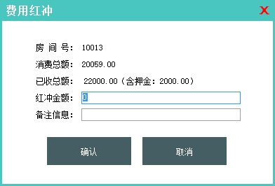 功能说明:该功能主要的作用是调整客房的消费总额,比如由于操作失误,增加消 费的时候录入错误或者宾客入住后,由于店内价格调整导致需要修正在店宾客的消 费总额的时候或者其他的特殊情况需要调整宾客的消费总额,就需要使用该项功能。在"费用冲红"界面,冲抵金额录入为正数,则确认后客房的消费总额会增加; 如果录入的冲抵金额为负数,则确认后客房的消费总额会减少。费用红冲操作将会 在客户的费用清单中增加一条项目名称为"费用红冲"的费用明细。