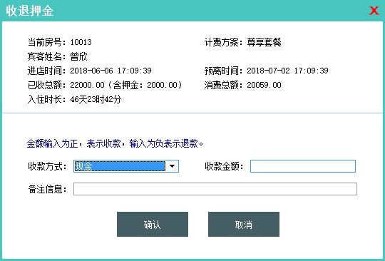 该功能主要有两项作用:1.收取押金 2.退押金;录入收款方式和收款金额,并填写备注信息之后点击确认即可完成操作。当收款金额录入为负值时软件 界面会显示为退款方式和退款金额,此时点击确认之后就会执行退款操作(退押金 也可以通过客户退款操作完成,不同的是客户退款操作不会减少客户的账户内的押 金金额)。