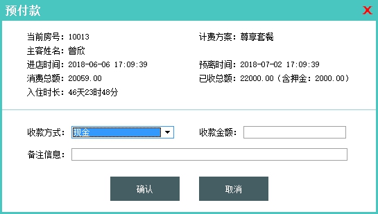 功能说明:该功能主要是针对在住客户在住期间临时性缴费的录入。比如客户在店消费后并未立即结算,而在未离店之前,可以通过预付收款的形式临时性收一笔款作为消费消费的结算款;或者客户有部分费用未及时交清,过后补录收款的情况,都可以使用预付收款来实现。预付收款会在客户的费用清单中记入一条费项名称为"预付款"的明细记录。 |