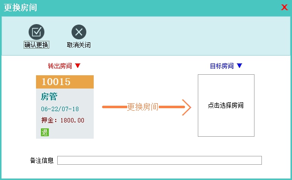 功能说明:该操作用来更换在住房间。如果换房前后的两个房间不存在差价问题,则直接换房即可,如果存在差价,则需要在换房之后通过增加自定义消费录入差价信息以保证费用的准确性。换房操作也可以在房态图界面直接拖动在住客房到其他的空房上面直接换房实现快速操作。由于软件不能自动补录差价需要用户通过手动操作来实现,所以换房需要注意差价补录的问题。 |