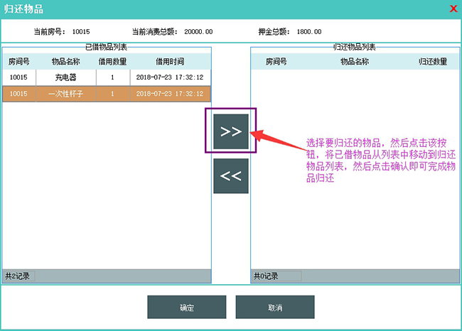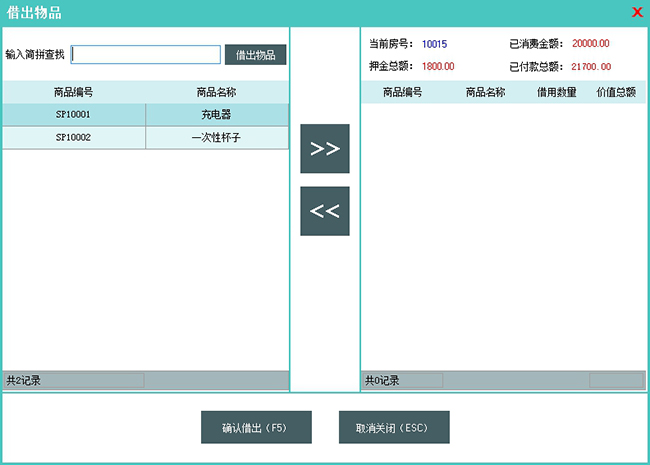 该操作记录宾客借用的物品信息。如果在店宾客有借用物品未归还的情况下结账离店的话,软件会弹出物品归还界面,显示已借用的物品信息,并要求归还之后才能结账离店。