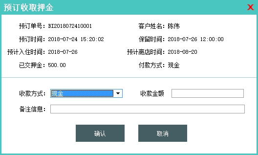 功能说明:针对预定单据收取预定押金(一般情况下在录入预定信息时就会录入收取的押金金额,该功能主要是用来录入预定完成之后客户补交的押金信息)。 |