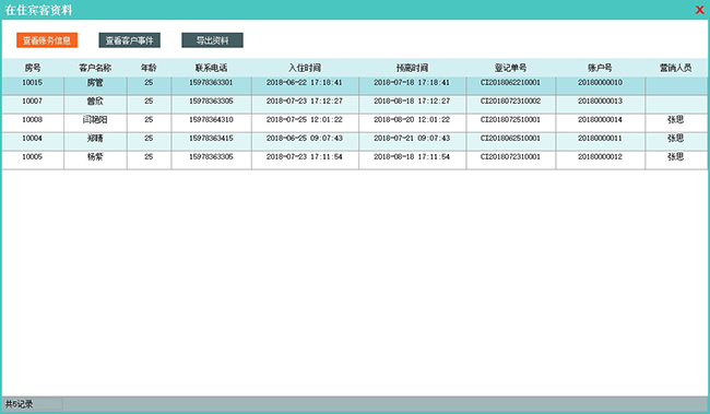 功能介绍:该模块集中显示当前在店入住客户的资料信息。方便快速查看客户的入住信息和联系电话信息。也可以通过"查看账务信息"快速查看单个客户的入住账务信息。