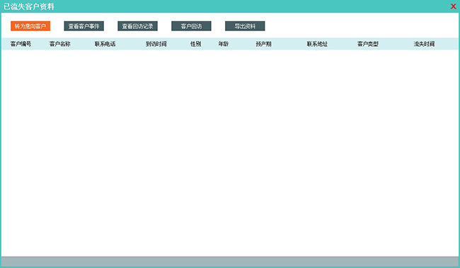 功能介绍:该模块集中显示已经流失的客户资料。方便用户针对流失客户做集中处理或者通过查看流失客户的回访、事件、账务资料做决策调整。 |