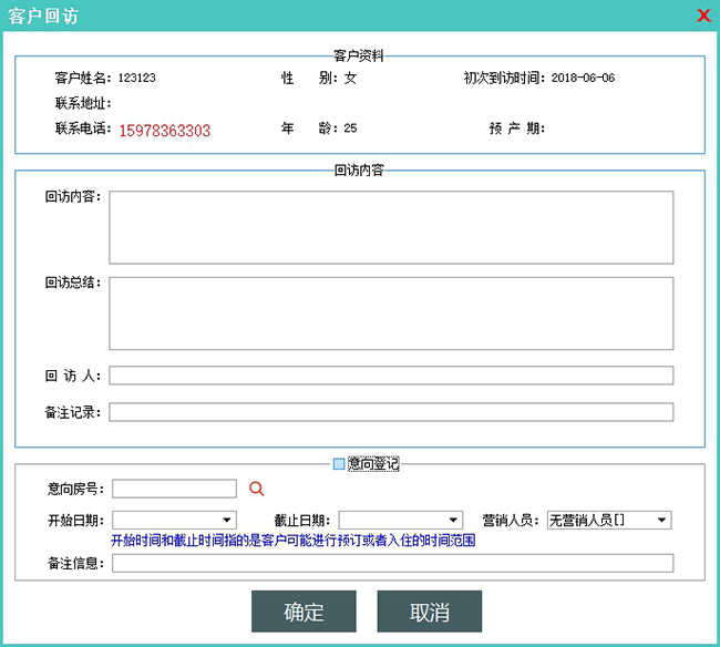 用来录入客户回访信息,也可以在录入时即时录入客户意向信息(需要勾选意向登记之后才可以录入意向信息),录入回访信息和意向信息分别可以在客户回访记录和客户意向管理中集中查看。