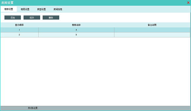 客房资料包含了楼栋、楼层、房型以及房间信息的设置。其中楼栋和楼层操作上比较简单,都是常规的添加、修改、删除就不再赘述。
