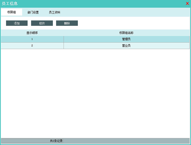 权限组:每一个员工对应一个权限组,可以通过对权限组分配不同的权限来实现 不同员工不同操作权限的需求。