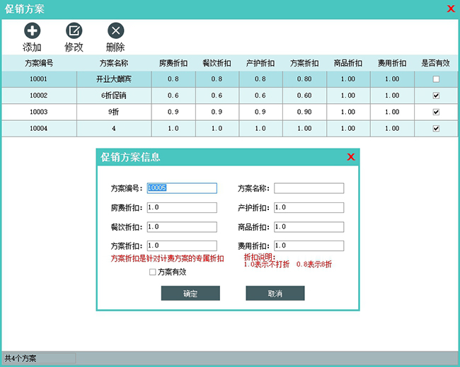 方案折扣:仅在登记入住时选择计费套餐时有效,该折扣对计费套餐总额进行折扣计算。