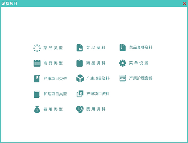 该模块主要用来录入店内基础消费项目信息。软件将消费项目分为4大类(餐饮[菜品、菜品套餐]、商品、产护[产康、护理、产康护理套餐]、费用),该模块属于基础资料录入,功能比较直接简单,就不再赘述了。