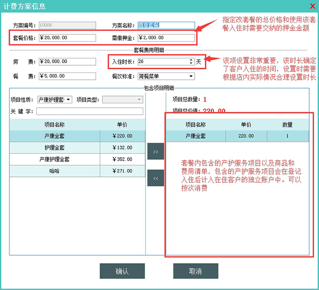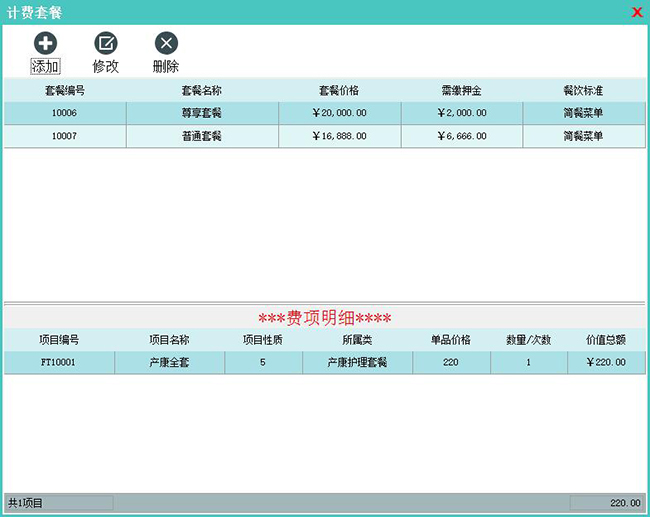 定义软件中的套餐项目(主要销售项目),计费套餐包含房费、餐费、产护服务项目套餐以及商品和附件费用。计费套餐单独定义单价。
