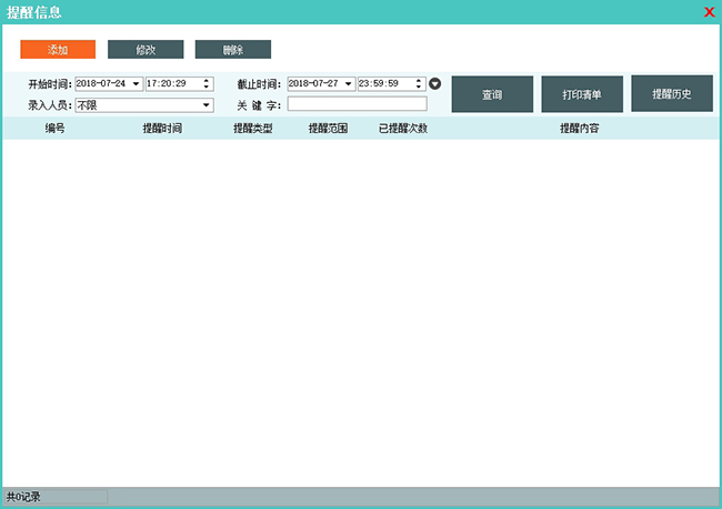 主要用来管理、查询一下日常提醒信息。默认显示当天要提醒的信息记录。