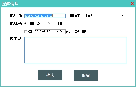 添加提醒时可以选择提醒一次或者每日提醒。默认提醒所有操作员,也可以指定提醒某一个操作员,当到达提醒时间时软件会弹出信息提醒窗口,点击“我知道了”之后,提醒信息将不再弹出(提醒信息将会被移动到提醒历史里面)。