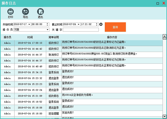 客户事件查询:可以统一查询所有客户的事件信息(客户事件由软件自动维护,会根据客户资料的录入、入住、缴费等操作生成一些事件信息)