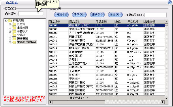 在商品信息窗口中左边是商品类别,右边列表中是该类别对应的商品。在某一类别上点击鼠标右键,可以新增类别,重命名和删除类别。新增的类别是属于所选类别的下一级,如果类别下有商品存在则该类别是不能被删除的。在类别名称后的文本框中可以输入类别名称或类别简码来查询需要的类别。