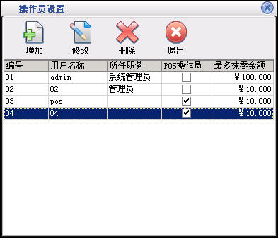 在基本设置模块中点击“操作员设置”按钮打开操作员设置窗口如图9。在窗口中可以看到所有的操作员(包括前台的收银员)。点击“增加”按钮打开增加操作员窗口,输入操作员的信息,操作员编号、操作员名称不能重复。点击“修改”按钮可以修改选中的操作员信息。点击“删除”按钮可以删除选中的操作员。“admin”操作员为超级管理员,有所有的权限,该管理员不能被修改和删除。系统中设定后台的操作员不能操作前台,前台的收银员也不能操作后台。