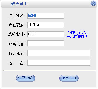 在基本设置模块中点击“员工信息”按钮打开员工信息窗口如图7。在窗口中可以看到所有的员工。点击“增加”按钮打开增加员工窗口,输入员工的信息,员工名称不能重复。点击“修改”按钮可以修改选中的员工信息。点击“删除”按钮可以删除选中的员工,如果该员工有业务发生则不能删除。点击“查找”按钮打开员工查询窗口,输入相应的条件查询不同的员工信息。点击“全部”按钮可以列出所有的员工信息。 |