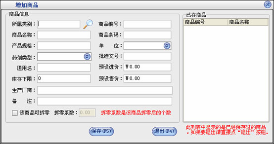 在商品信息这一部分输入新增商品的所有信息,点击“保存”按钮即可把该商品保存到右边的已存商品中,保存后可以继续输入下一种商品。在“已存商品”中可以点击鼠标右键对选中的商品进行删除或删除全部已存的商品。如果商品增加完后可以直接点“退出”按钮。退出增加商品窗口后会在商品列表中看刚才增加的商品。如果要修改商品,先选中要修改的商品,点击“修改”按钮打开商品修改界面,在商品修改界面中修改相应的信息点击“保存”即可。点击“删除”按钮即可以把选中的商品删除,该商品发生过业务则是不能删除的。