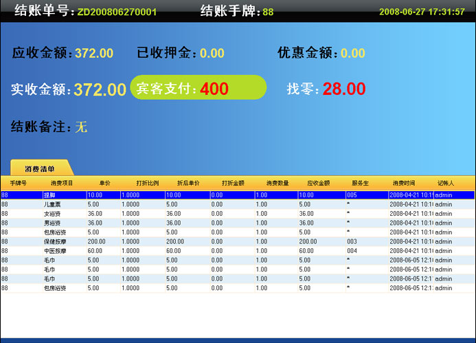 | 此部分内容显示,当操作员在足浴管理系统进行结帐操作时,此界面即显示,收银员操作同步。当关闭结帐窗口时,此界面即关闭返回到主界面(图一)。 | |