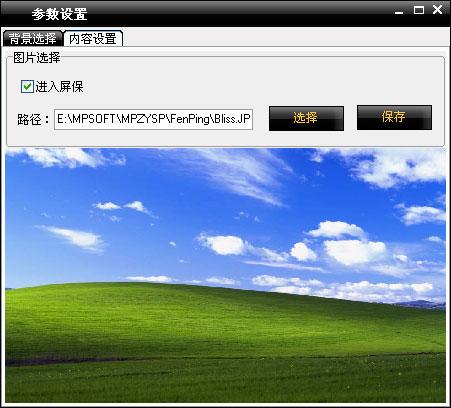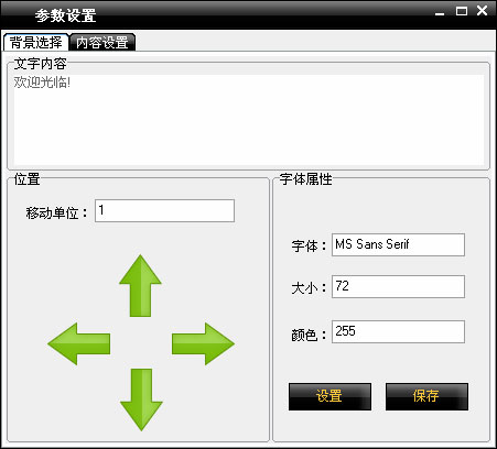 在“背景选择”(图二)中,可以显示当前背景图片的,在“内容设置中”(图三)显示在请窗口中的文字内容可对其大小、字体、位置、颜色等设置。其位置可在主窗口中拖动来调整。 |