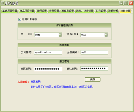 储值卡、计次卡、折扣卡。 2、IC卡只能使用M1卡吗,插拔式的西门子4442卡可不可以? 不可以,只有M1卡可以满足空间需求。 3、我登录后觉得和原版没什么区别呀,怎么设置使用IC会员连锁? 登录后默认是不连接IC读写器的,需要启用连锁功能。方法是进入【系统设置】【连锁设置】,选上【启用M1卡连锁】后保存,重启软件。如下图: