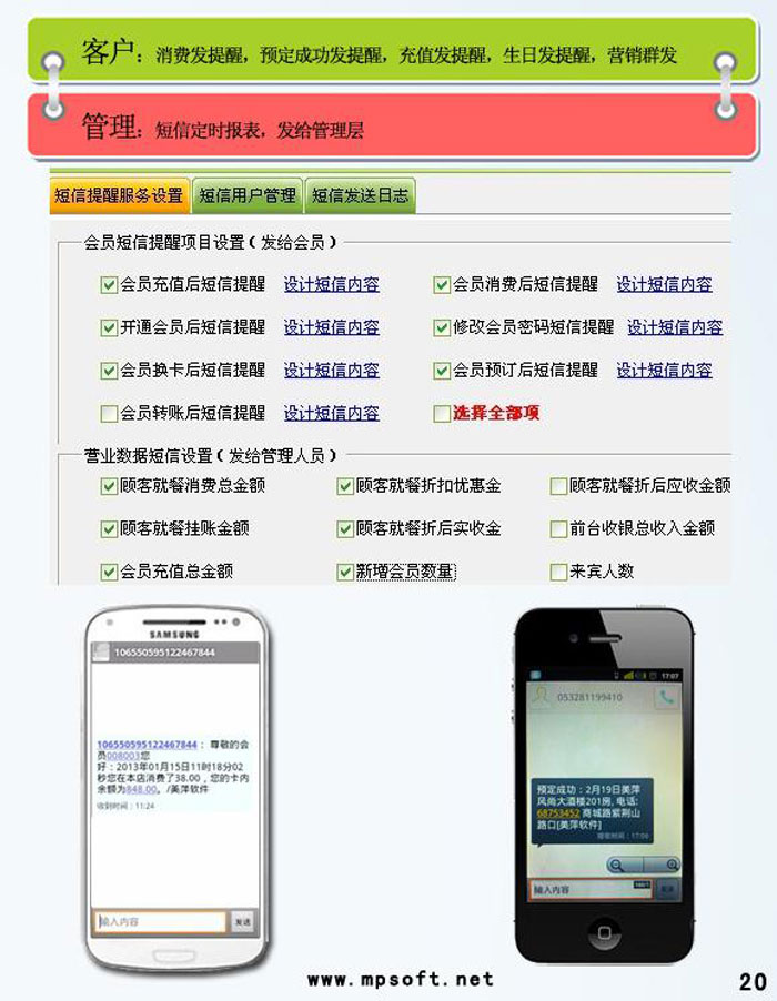| 美萍餐饮ERP短信提醒功是美萍餐饮ERP软件集成的一项功能,但需要另行开通使用。分为2类短信提醒。对会员客户:开通以后可实现对会员消费情况的短信发送;对公司管理层:管理层每日营业状况信息情况,自动定时发送。