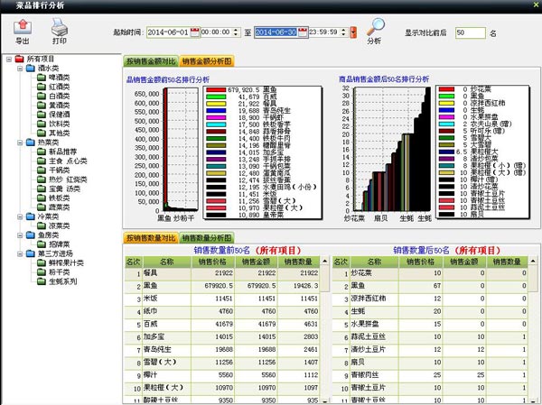 ◇支持业务统计分析:商品业务统计排行、特价促销菜品统计、内部月消耗统计、经理接触分析汇总表