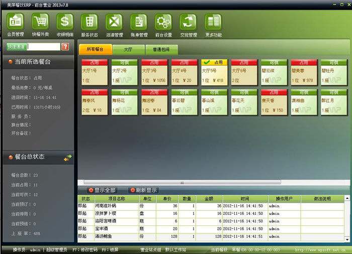 ◇ 提供发票礼券管理,交班,日结,经理查询,前台会员充值等。:查询餐台使用状态,进行开台、换台、并台、撤台、修改台头等操作。
