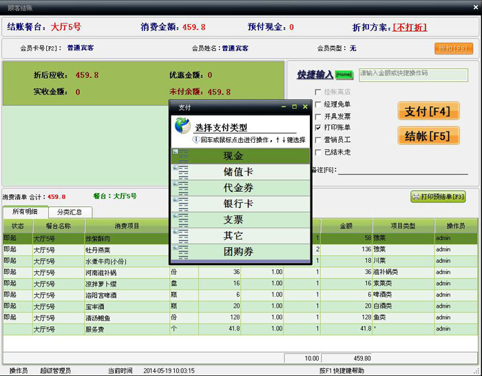 ◇支持现金、储值卡、信用卡、代金券等多种方式,同时也可以自定义增加其它的付款方式
