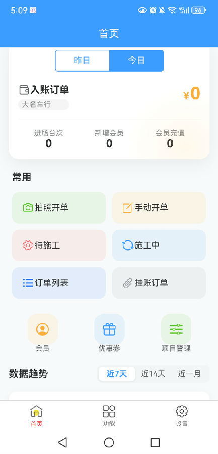 首页展示近 7 天 / 14 天 / 1 个月的业务数据趋势,包括进场台次、新增会员、会员充值等,帮助管理者快速掌握经营动态。