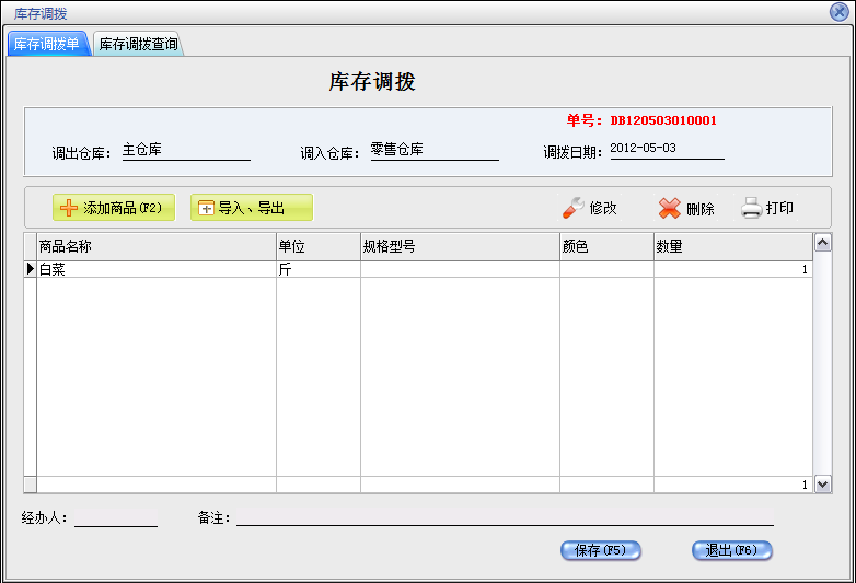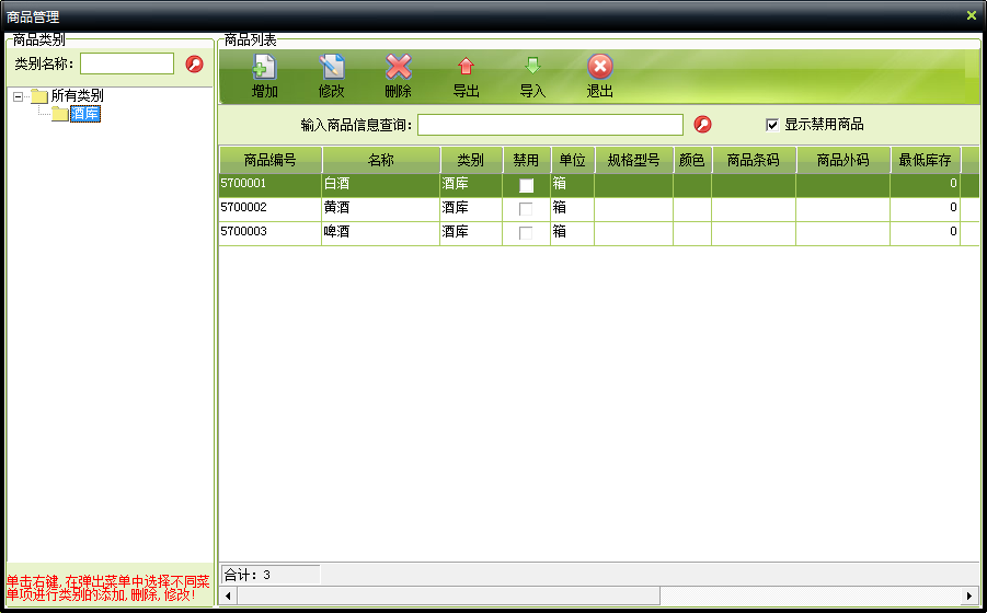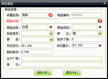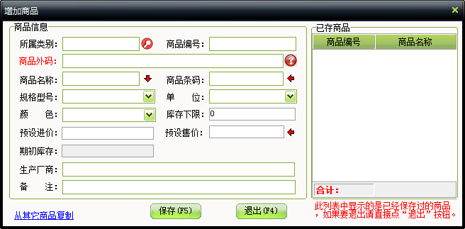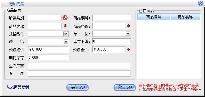 在商品信息这一部分输入新增商品的所有信息,点击"保存"按钮即可把该商品保存到右边的已存商品中,保存后可以继续输入下一种商品。在"已存商品"中可以点击鼠标右键对选中的商品进行删除或删除全部已存的商品。如果商品增加完后可以直接点"退出"按钮。退出增加商品窗口后会在商品列表中看刚才增加的商品。如果要修改商品,先选中要修改的商品,点击"修改"按钮打开商品修改界面,在商品修改界面中修改相应的信息点击"保存"即可。点击"删除"按钮即可以把选中的商品删除,该商品发生过业务则是不能删除的。
