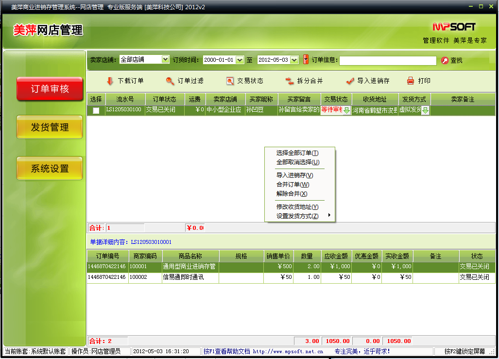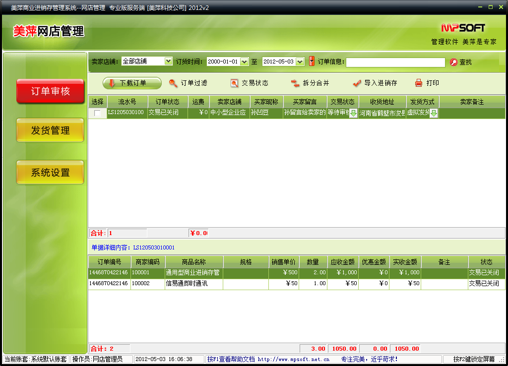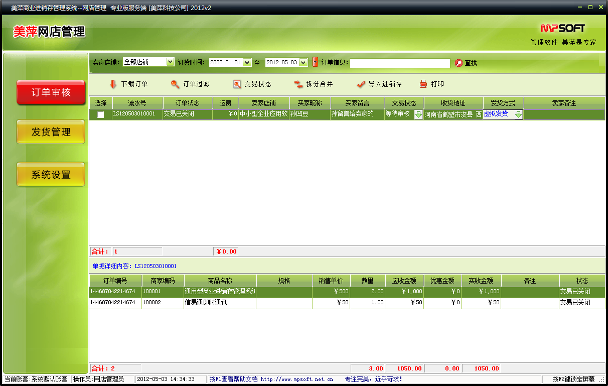 答:网店进销存软件管理的主要是网店订单,通过下载到的客户订单,自动在后台(美萍商业进销存管理系统)产生相应的业务单,同时引起商品库存及资金的变化。