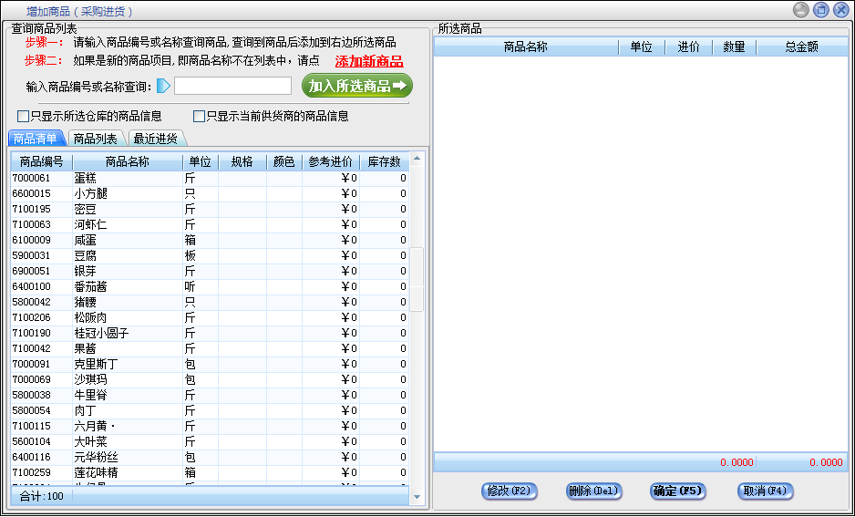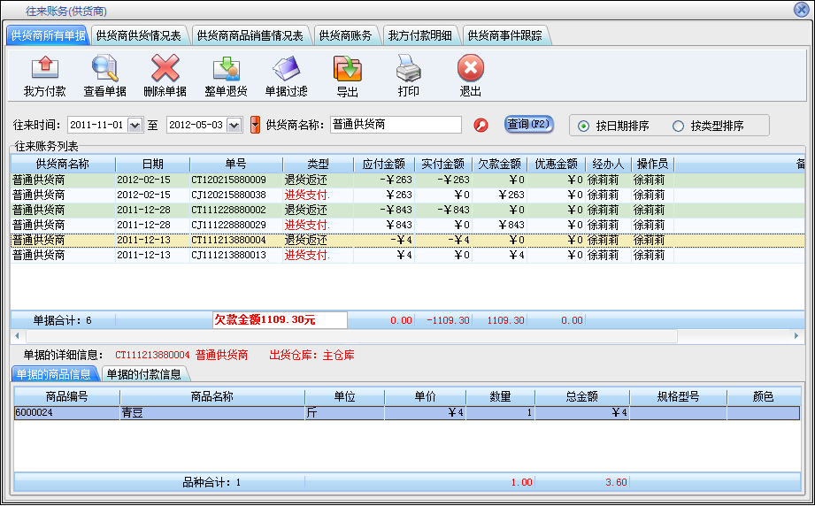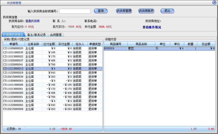 进货管理:进行商品采购入库,采购退货,进/退单据和当前库存查询,与供货商的往来帐务。