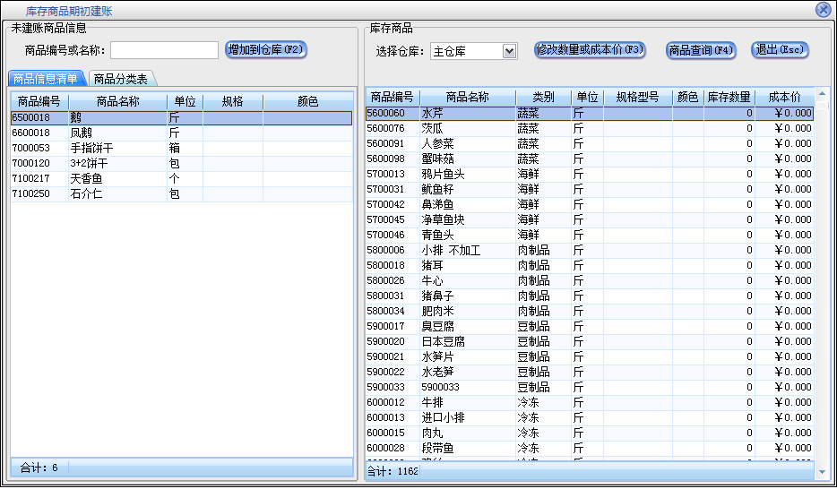 在窗口中的商品信息中可以看到所有已经增加过的商品信息,在右边的库库商品中选择仓库,可以看到该仓库中的商品。在商品信息中可以选择中一种商品点击"增加到仓库"在出现的窗口中输入期初数据和成本价,这样就可以建立该商品在指定仓库的初期帐。