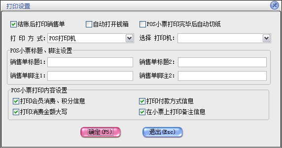 打印设置:设置小票的标题和脚注以及要选择的打印机。