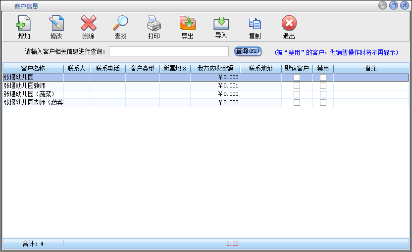 在基本设置模块中点击"客户信息"按钮打开客户信息窗口如图6。在窗口中可以看到所有的客户。点击"增加"按钮打开增加客户窗口,输入客户的信息,客户名称不能重复。如果该客户有期初金额则在"期初应收"后输入相应金额。如果选择中"默认客户"在商品业务和顾客退货打开窗口的时候显示的为该客户,默认客户只能有一个。点击"修改"按钮可以修改选中的客户信息。如果该客户有业务发生则不能修改期初应收金额。点击"删除"按钮可以删除选中的客户,如果该客户有业务发生则不能删除。系统有一个"普通客户"是不能被删除的。点击"查找"按钮打开客户查询窗口,输入相应的条件查询不同的客户信息。点击"全部"按钮可以列出所有的客户信息。 |